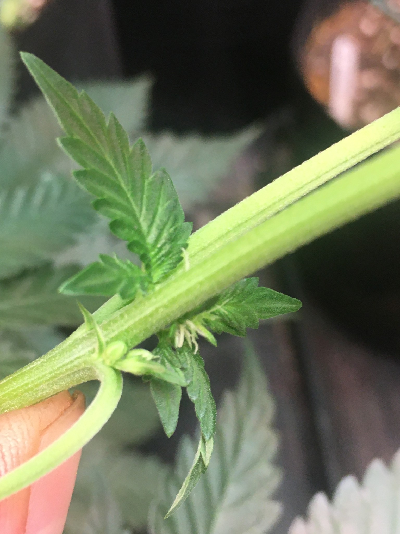 individual showing 'early slight intersex traits'. Only some of the lower buds on secondary level branching displayed these pairs of pollen sacks at the very base of where flowers set. Observe closely and remove. This plant wasnt topped and was around day 12-14 of 12-12
