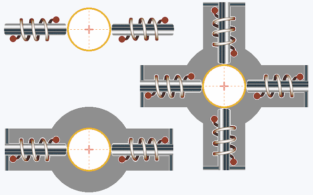 About splitting an air-core selenoïd in opposite-polarity halves, using a parallel magnetic bridge (shown as large grey items above selenoïd + core elements), which bring another matter: that of Flux-Concentration and hence also of "Flux-Bending", including the conceptual opportunities this invites...